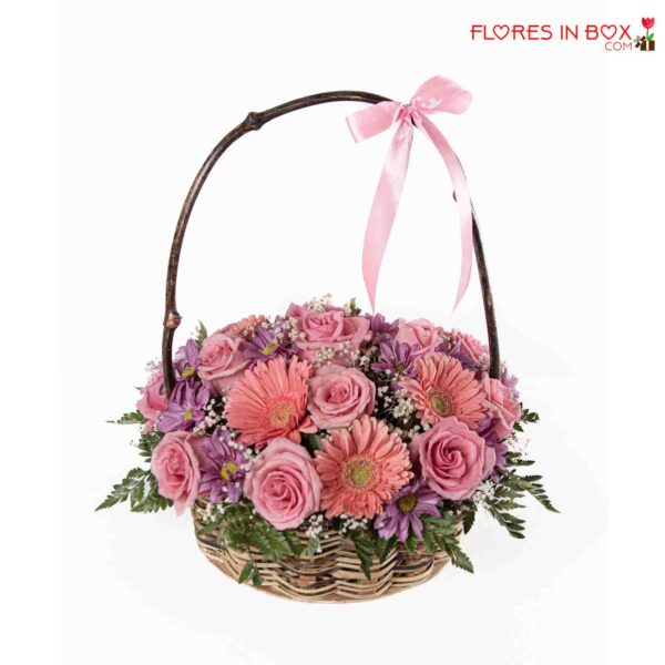 Bellas Canasta de Rosas Rosadas, Gerberas y follage