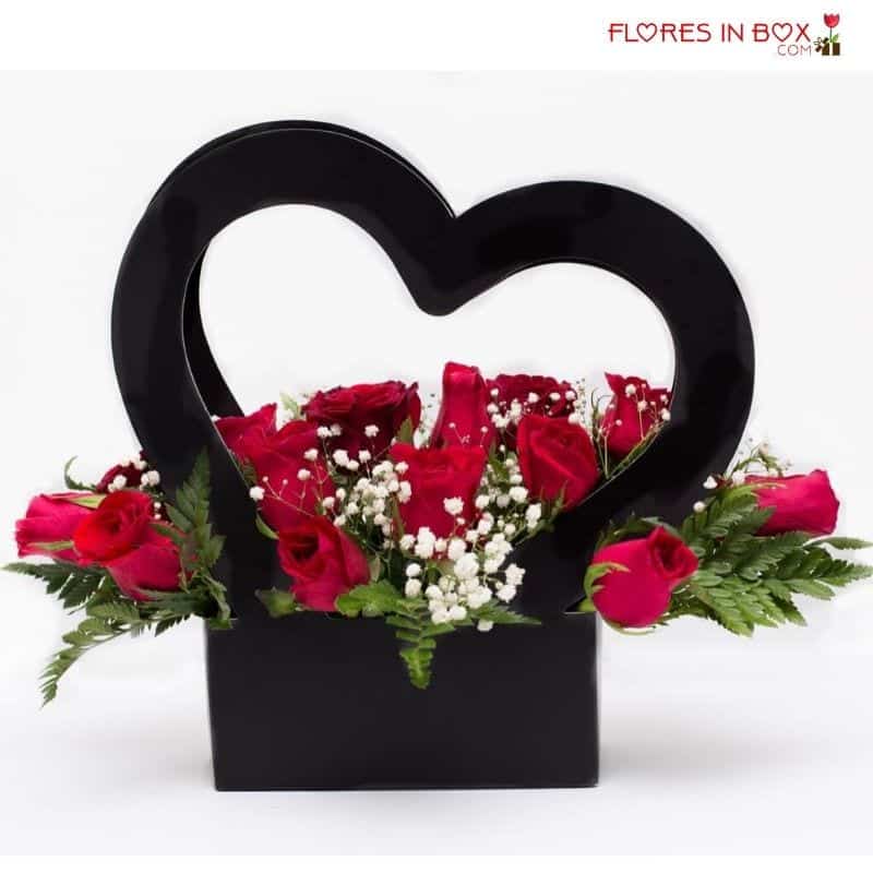Linda caja con en forma de corazón con base negra y rosas rojas.