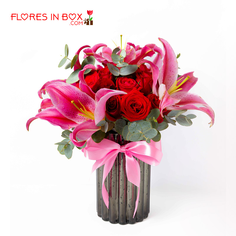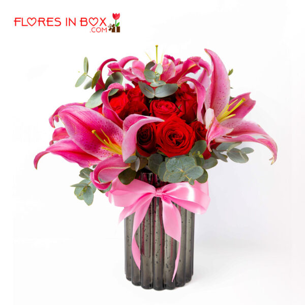 Bello arreglo de rosas rojas y Lirios en una bella base de vidrio