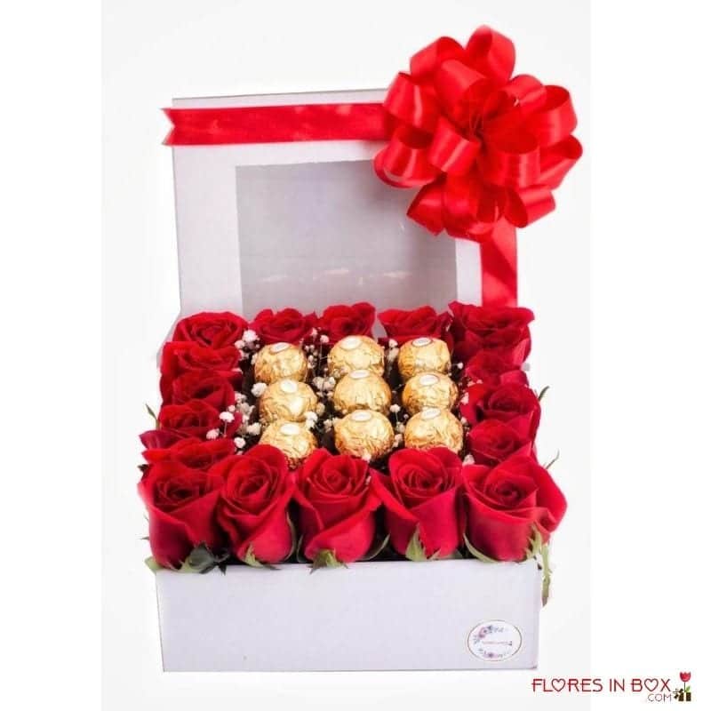 Bella caja decorada con rosas y al centro elegantes chocolates Ferrero Rocher. *Color de la caja sujeto a disponibilidad.