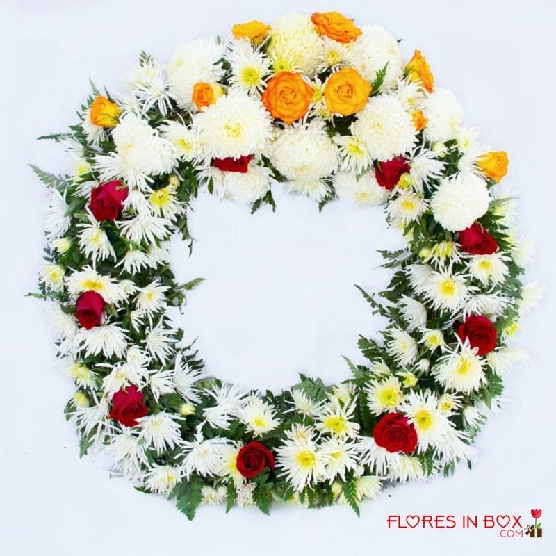 Colorida corona fúnebre con rosas, funerales y condolencias.