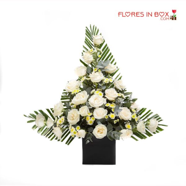 Arreglo floral de duelo elaborado con rosaas blancas y follage