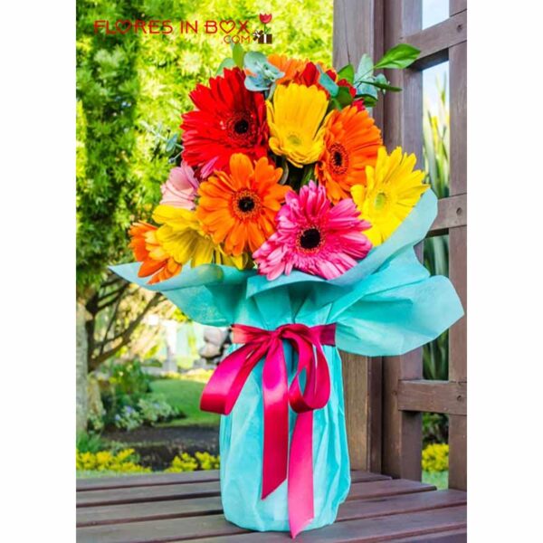 Gerberas de diferentes colores en lindo florero forrado delicado papel decorativa