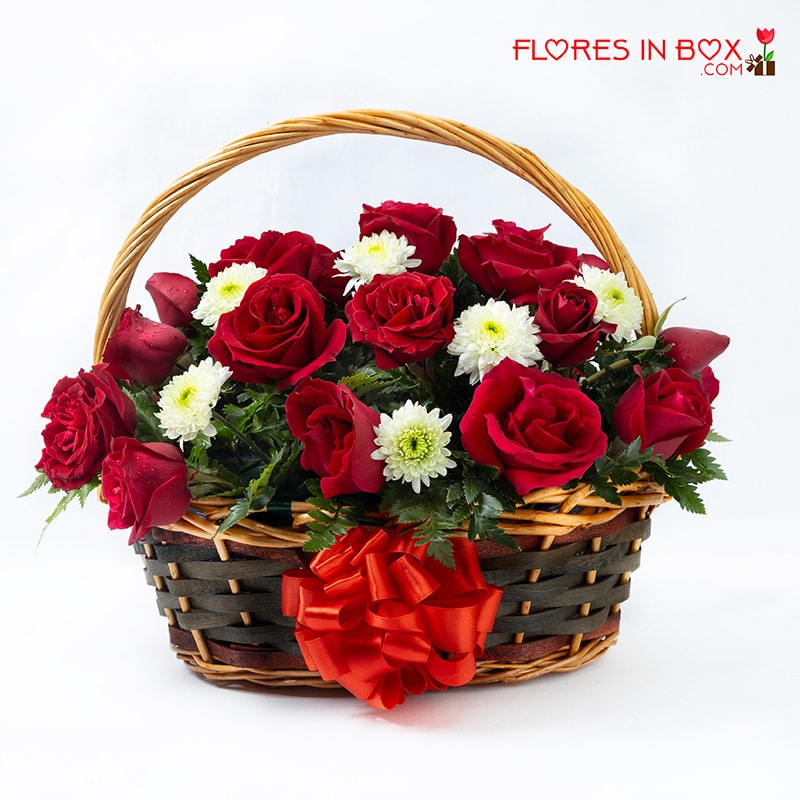 Elegante canasta de rosas rojas y fogaje que hacen una combinación perfecta de armonía y delicadeza.
