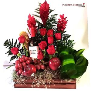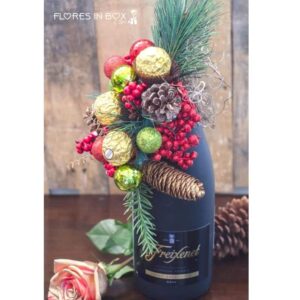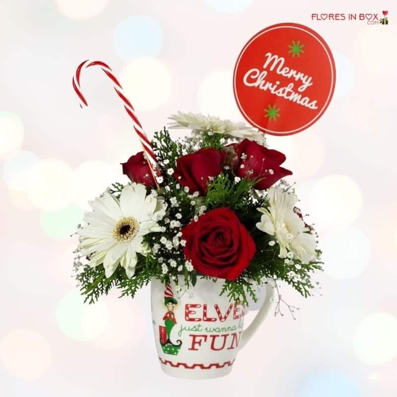 Hermosa taza navideña con rosas rojas, gerberas blancas y decoración navideña.