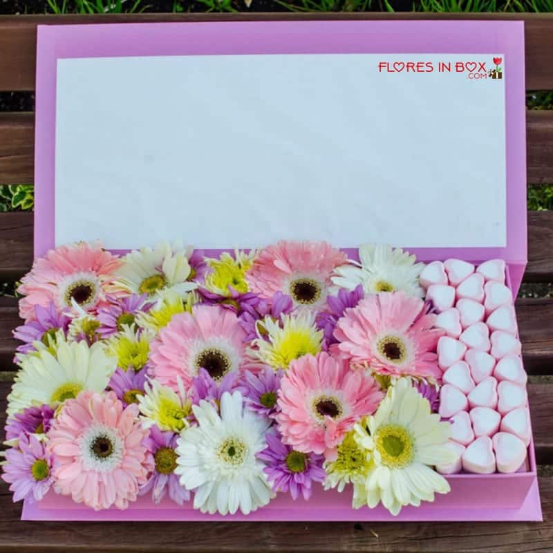 Hermosa caja de Gerberas con una combinación de Mashmelos en forma de corazón