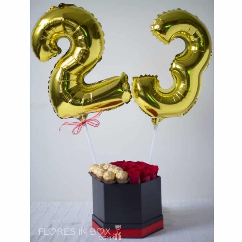 Elegante arreglo de cumpleaños con rosas y chocolates Ferrero Rocher sobre una lujosa caja negra.