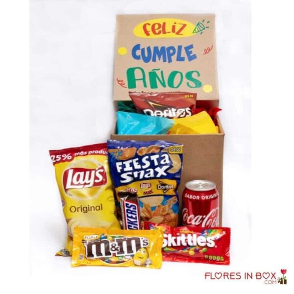 Deliciosa caja decorada que incluye: 3 snacks, 1 Pringles, 3 chocolates, 1 Coca Cola.