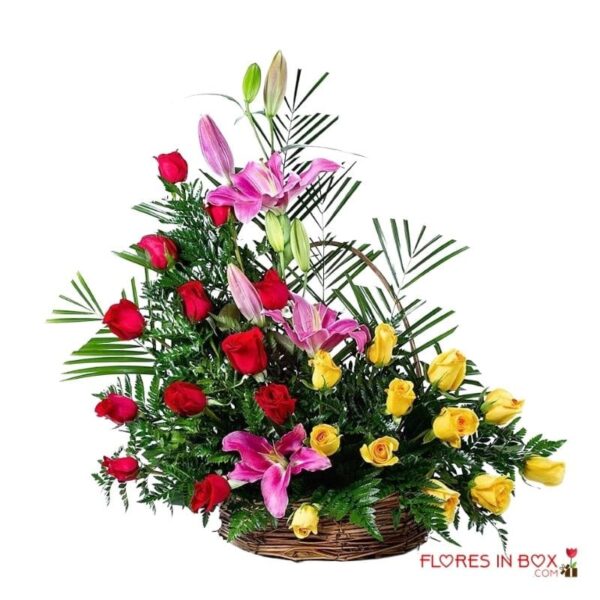 Precioso arreglo con lirios, rosas y más sobre una canasta de mimbre.