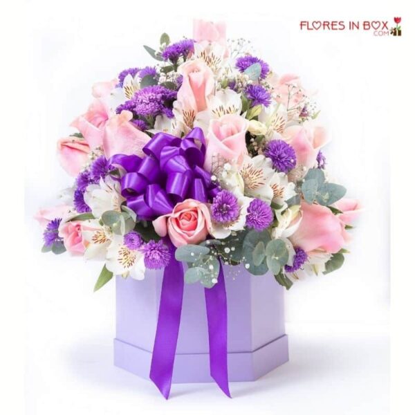 Hermoso arreglo con rosas, montecasino, eucalipto sobre una preciosa caja lila con listón.