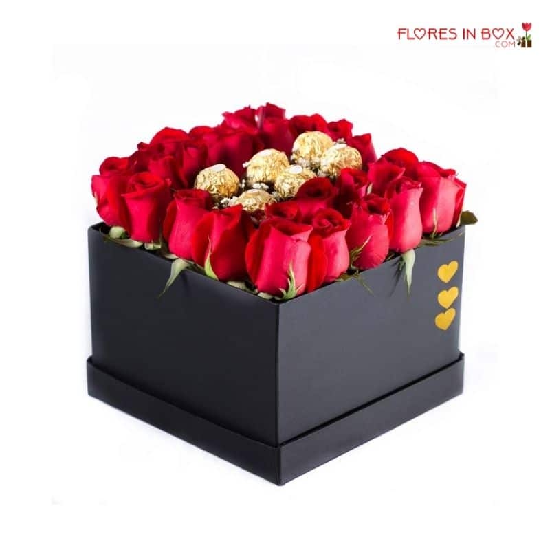 Exquisita caja de chocolates Ferrero Rocher con rosas rojas.