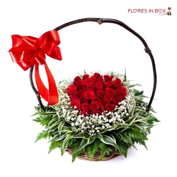 Preciosa canasta de mimbre con rosas rojas sobre elegante follaje.