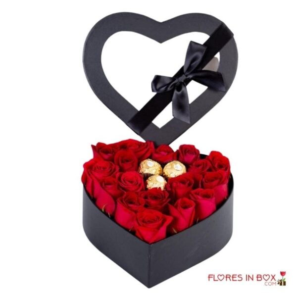 Grandiosa caja negra en forma de corazón con rosas y chocolates Ferrero Rocher.
