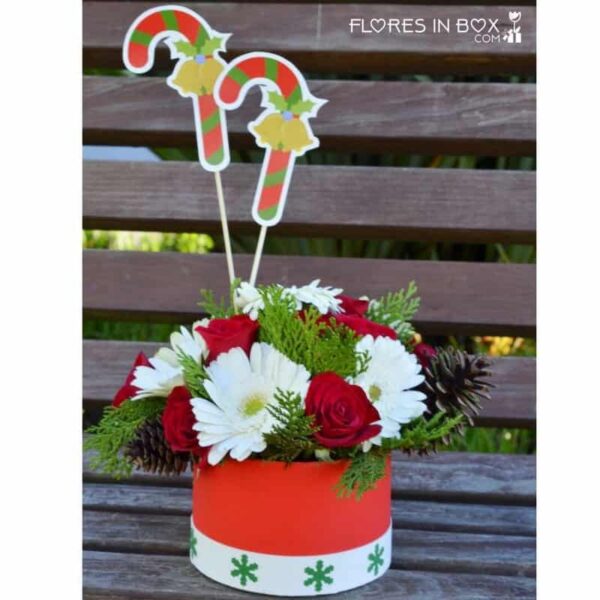 Hermoso arreglo floral navideño con rosas, gerberas y adornos de la temporada.