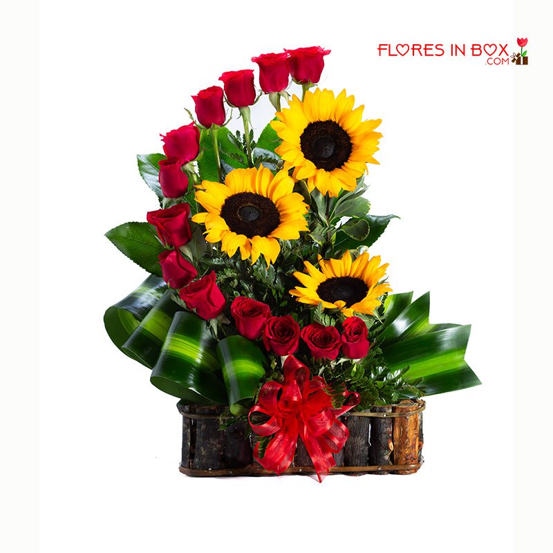 Arreglo que combina rosas rojas y girasoles acompañado de follage