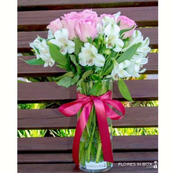 Hermoso ramo de flores con una linda base de vidrio. Un arreglo elegante, discreto y apasionado.