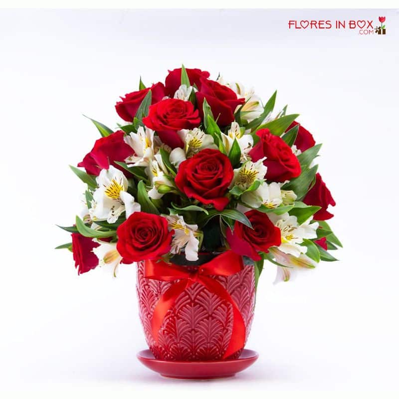 Hermoso arreglo de rosas y alstromerias blancas con una base romántica roja.