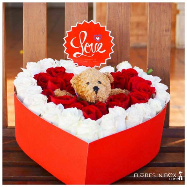 Hermoso arreglo de corazón con un peluche. *Los peluches están sujetos a disponibilidad.