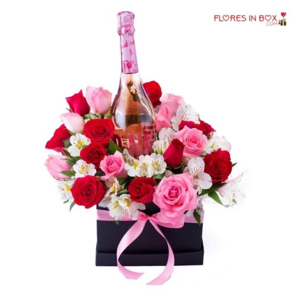 Exclusivo arreglo de amor con flores de muchos colores con una botella de vino rosa.